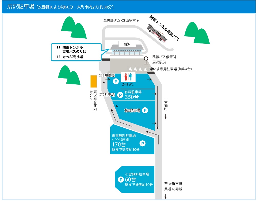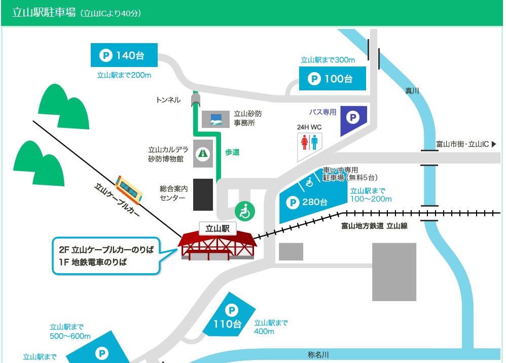토야마 쪽에서 접근하면 다테야마역 인근에 무료 주차장이 산재.